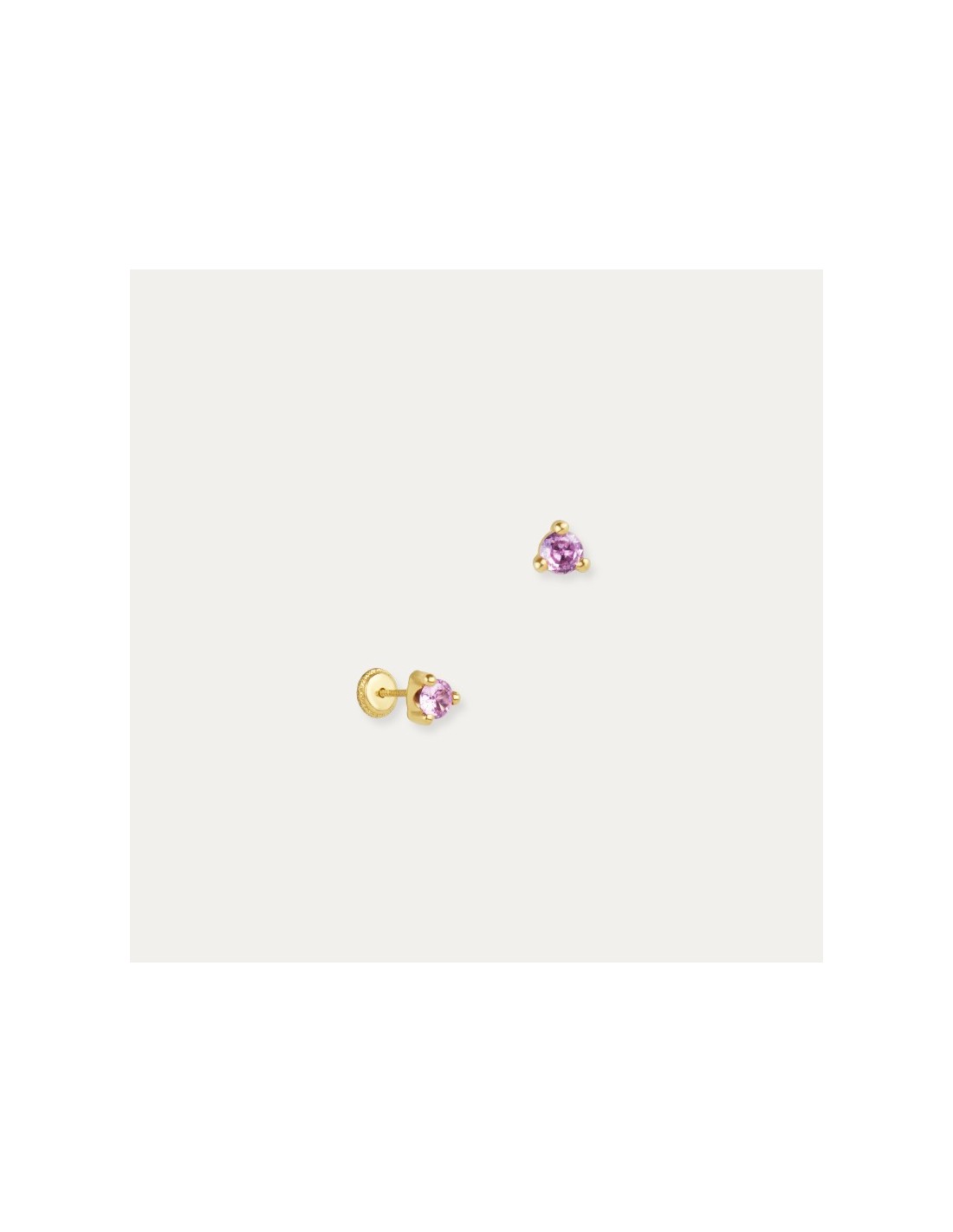 Pareja de pendientes pequeños de tuerca, fabricados en Oro de 9 kilates con una piedra de color amatista en tres garras.
