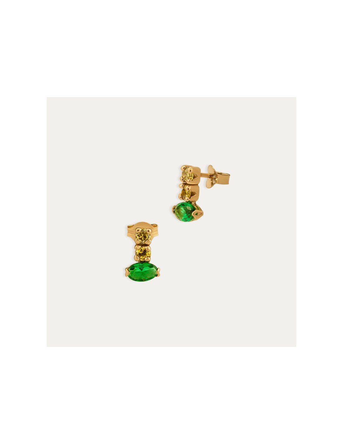 Par de pendientes fabricados en Oro de 9 kilates con piedras de color, destaca la de color esmeralda, ya que combina perfectamente con las sortijas de la colección Gummy.