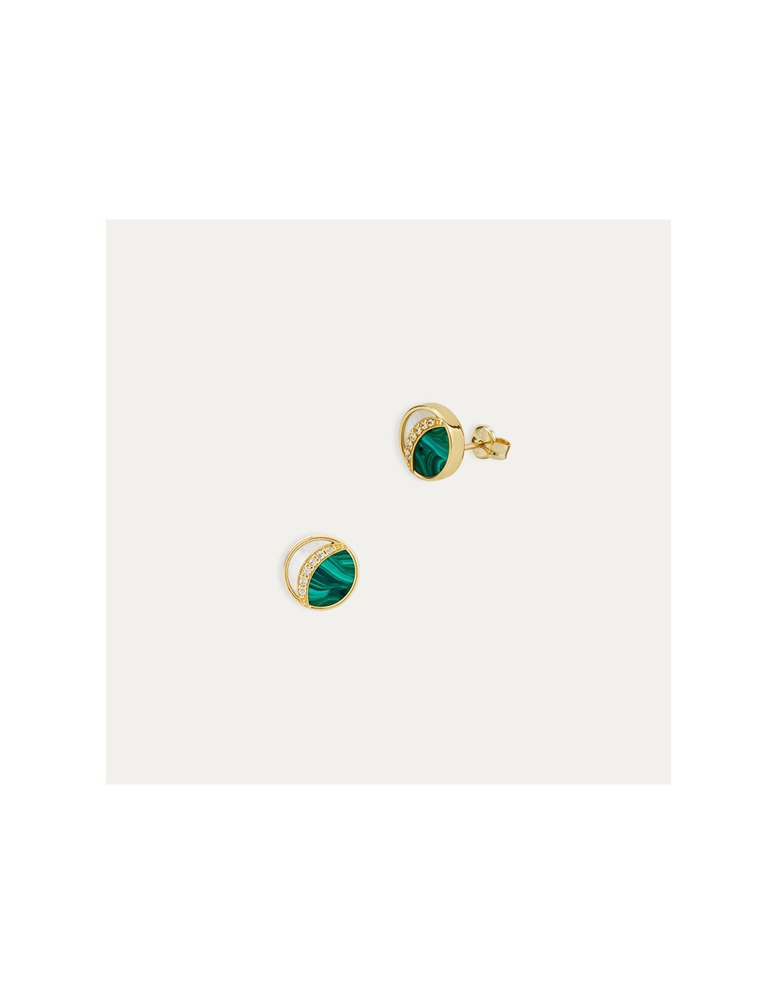 Par de pendientes en Oro de 9 kilates con forma de luna con piedra color malaquita, decorados con circonitas y media luna de efecto nácar. Una colección única y al alcance de todos.