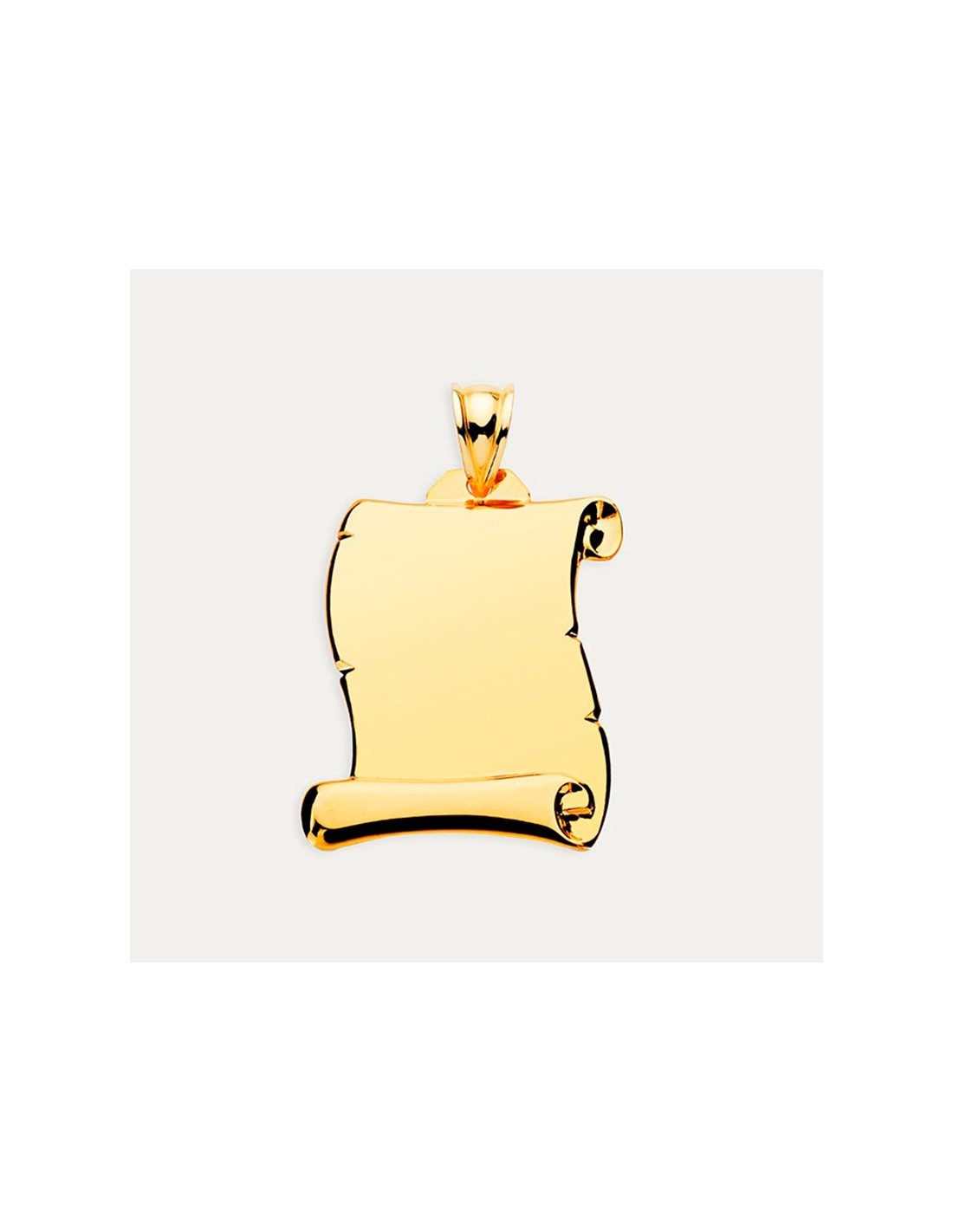 Placa estilo pergamino en oro de 18 kilates con acabado brillante, ideal para grabar o personalizar con una fotografía.