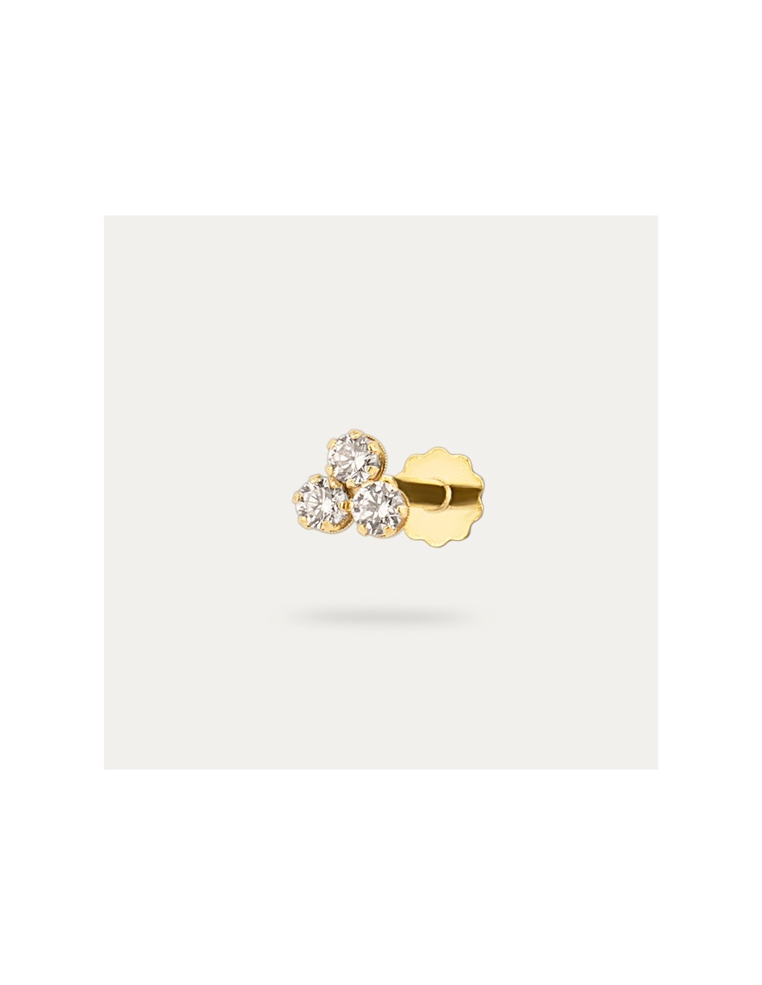 Pendiente estilo piercing fabricado en Oro de 9 kilates con rosca tipo tronillo y motivo de tres circonitas en garras.