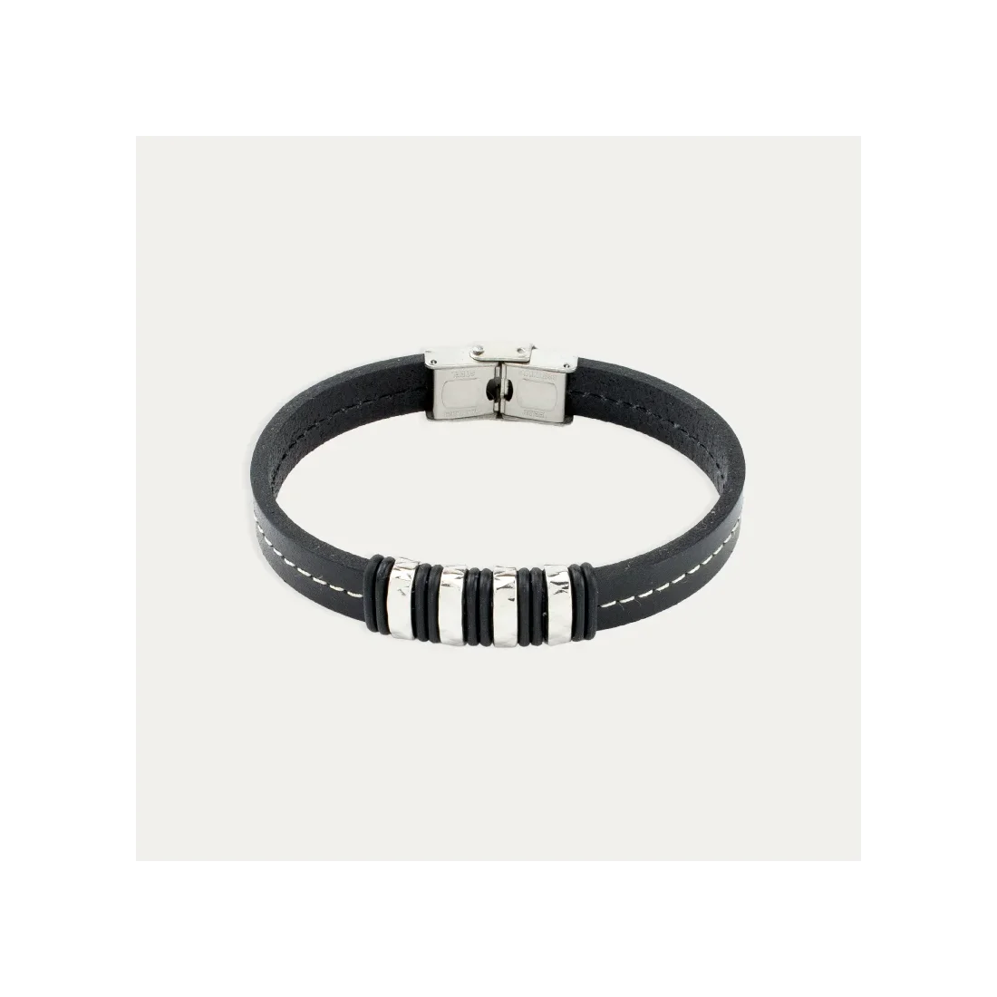 Pulsera de cuero negro con motivo central de acero y caucho, además lleva un pespunte en hilo blanco.