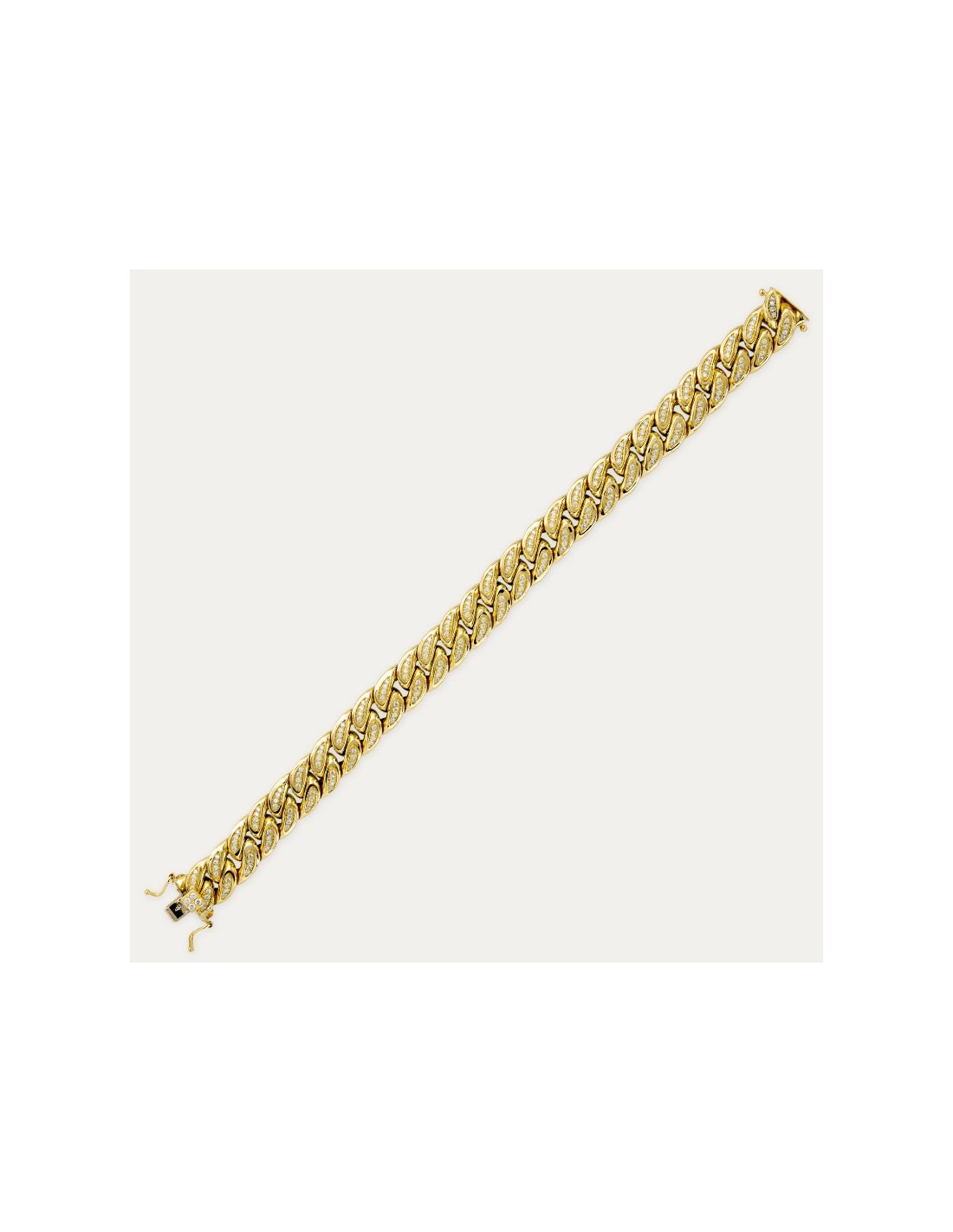 Pulsera en Oro de 18 kilates con eslabón barbado estila cubana decorado con circonitas. Una pieza llamativa y única, que destaca por su brillo y elegancia.