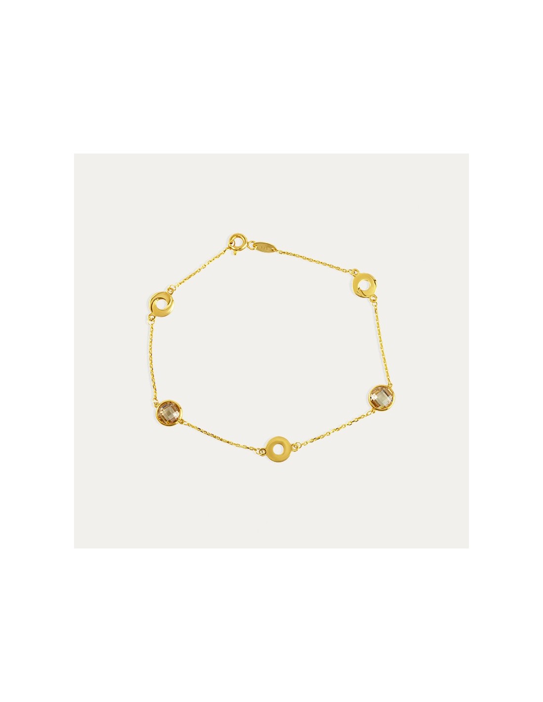 Pulsera en Oro de 9 kilates con dos piedras engastadas de color turmalina y tres motivos de circulo que completan la joya, la cual podrás combinar con la gargantilla de la misma Colección Khamil.