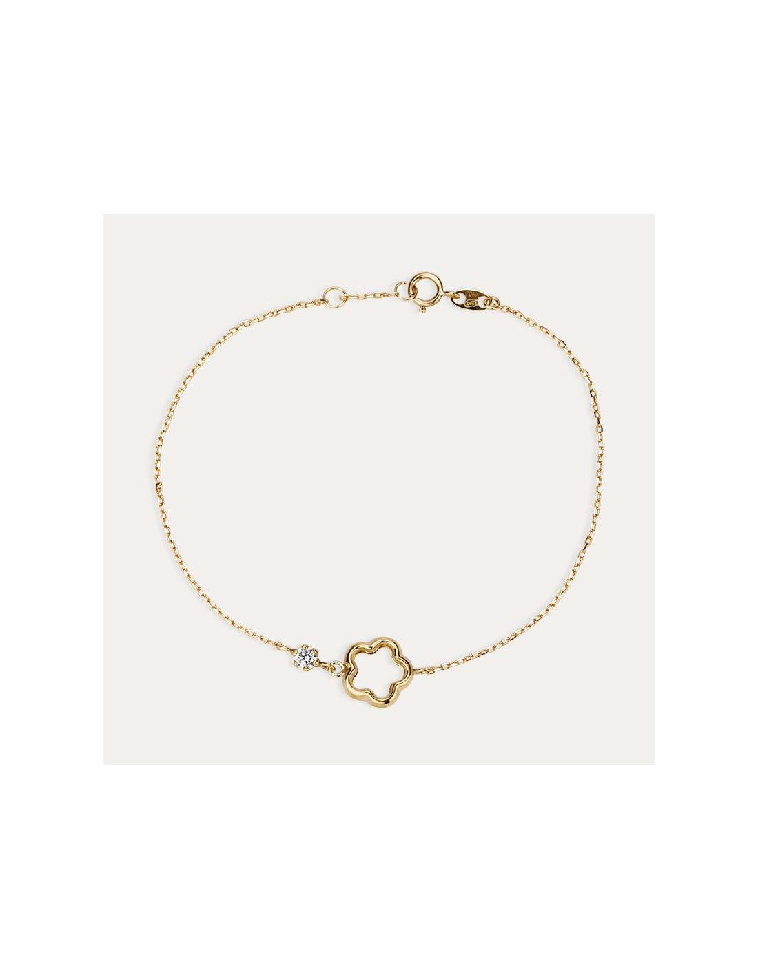 Pulsera fabricada en oro amarillo de 9 quilates con motivo de flor y pequeña circonita.