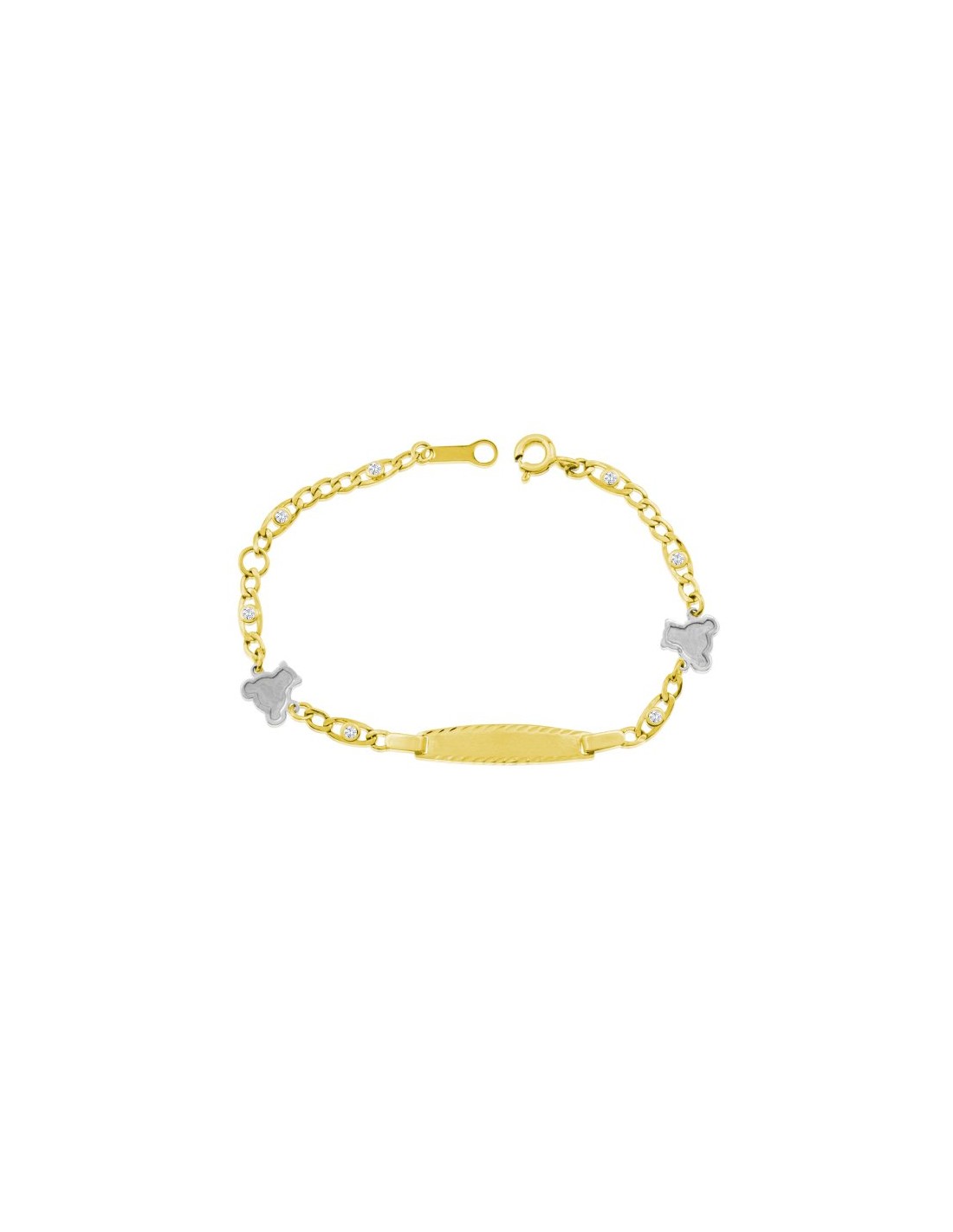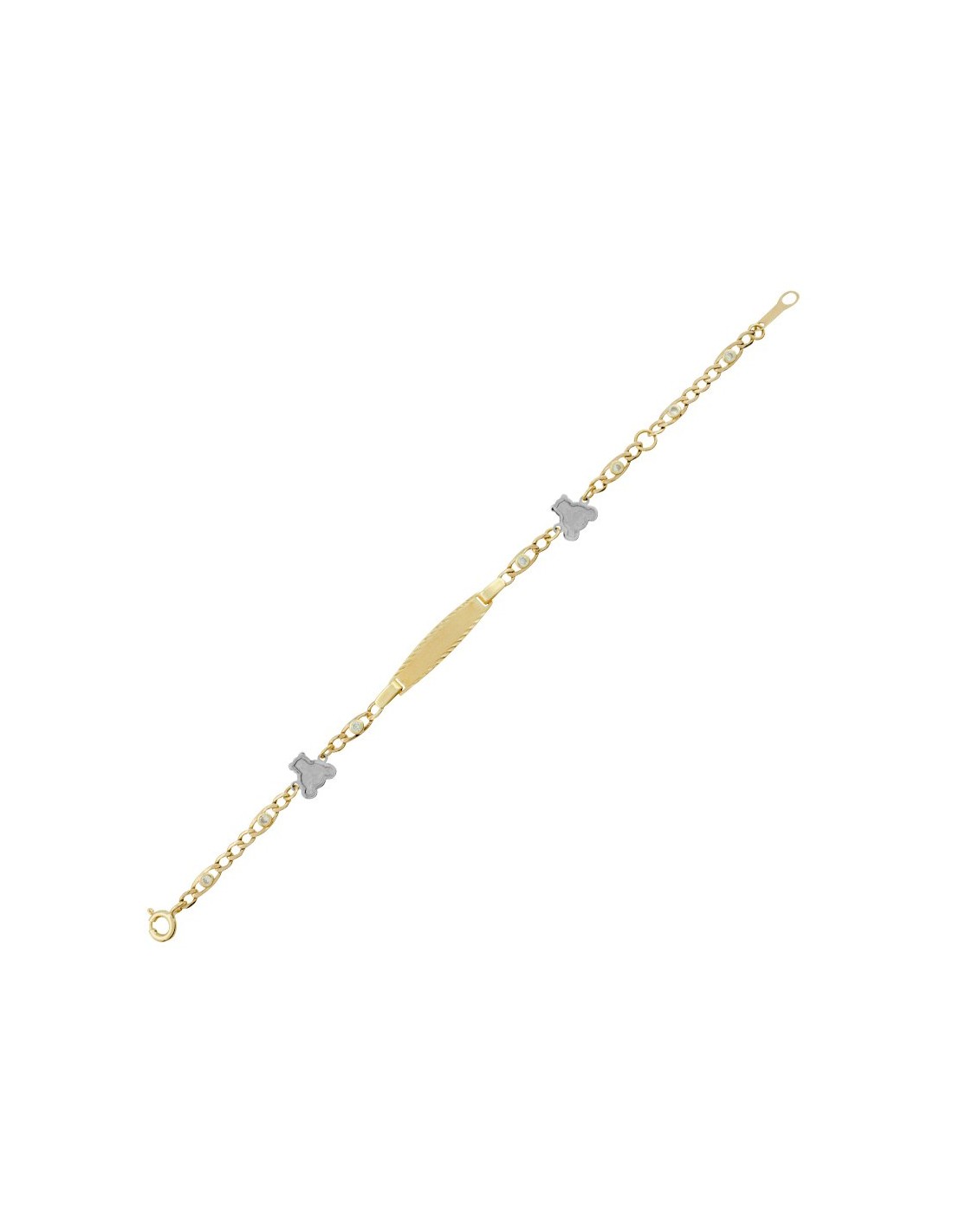 Pulsera infantil en Oro 9 quilates con chapa para grabar, motivo de ositos en oro blanco y cierre timón.