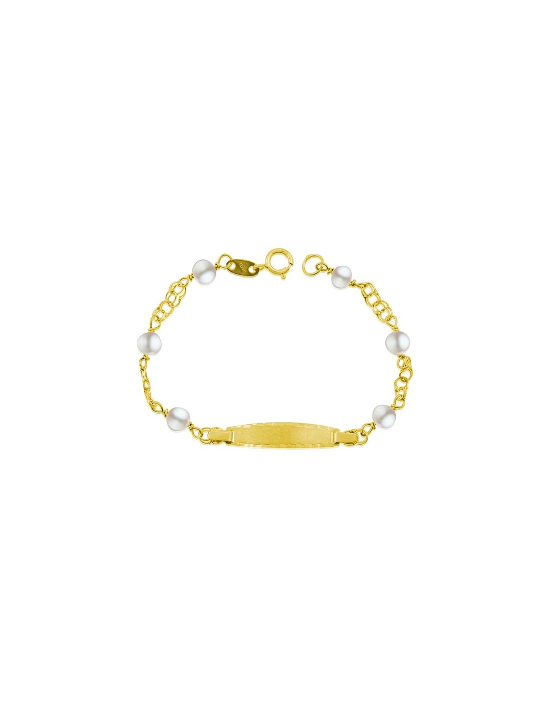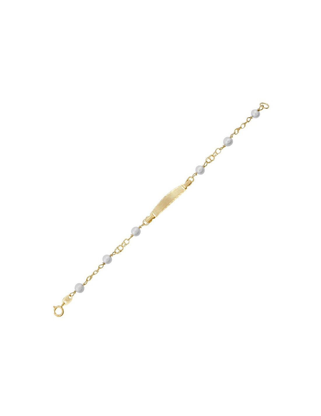 Pulsera infantil en Oro 9 quilates con chapa para grabar, perlas y cierre timón.