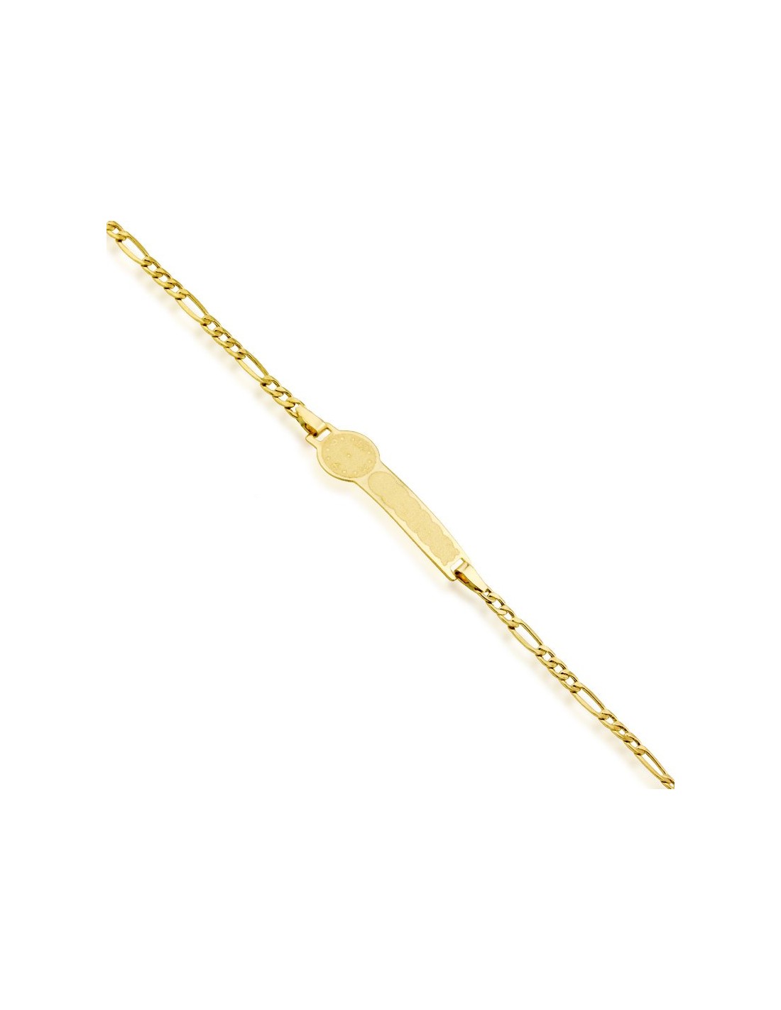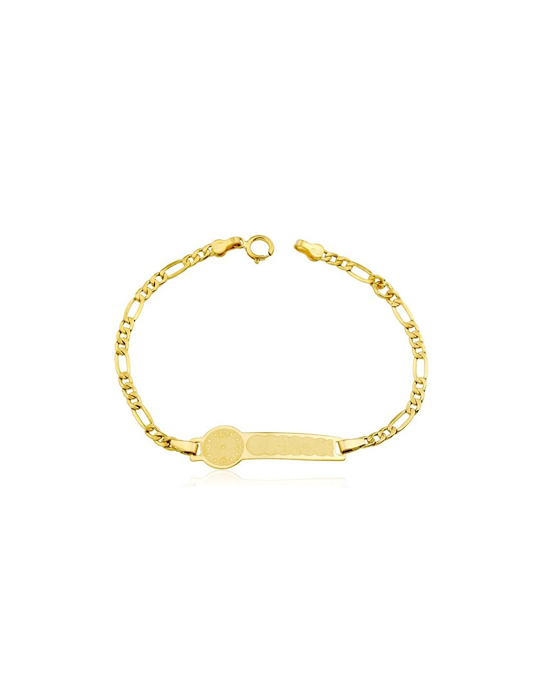 Pulsera bebe en Oro 9 kilates con chapa personalizable y reloj para grabar la hora del nacimiento con eslabones 3x1.