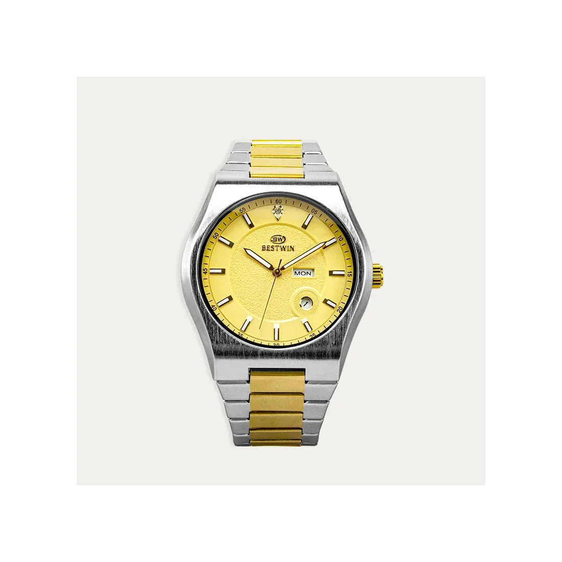 Reloj para caballero fabricado en acero bicolor con esfera en acabado dorado. Incluye dial de calendario con semanario.