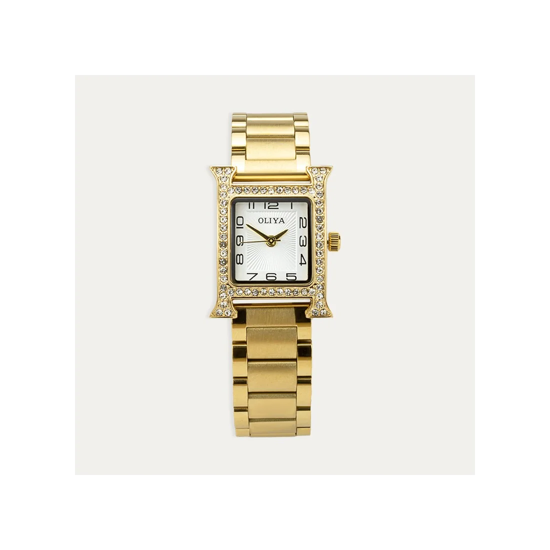 Reloj clásico con forma cuadrada fabricado en acero dorado. Incluye unas preciosas circonitas bordeando la esfera de la pieza.