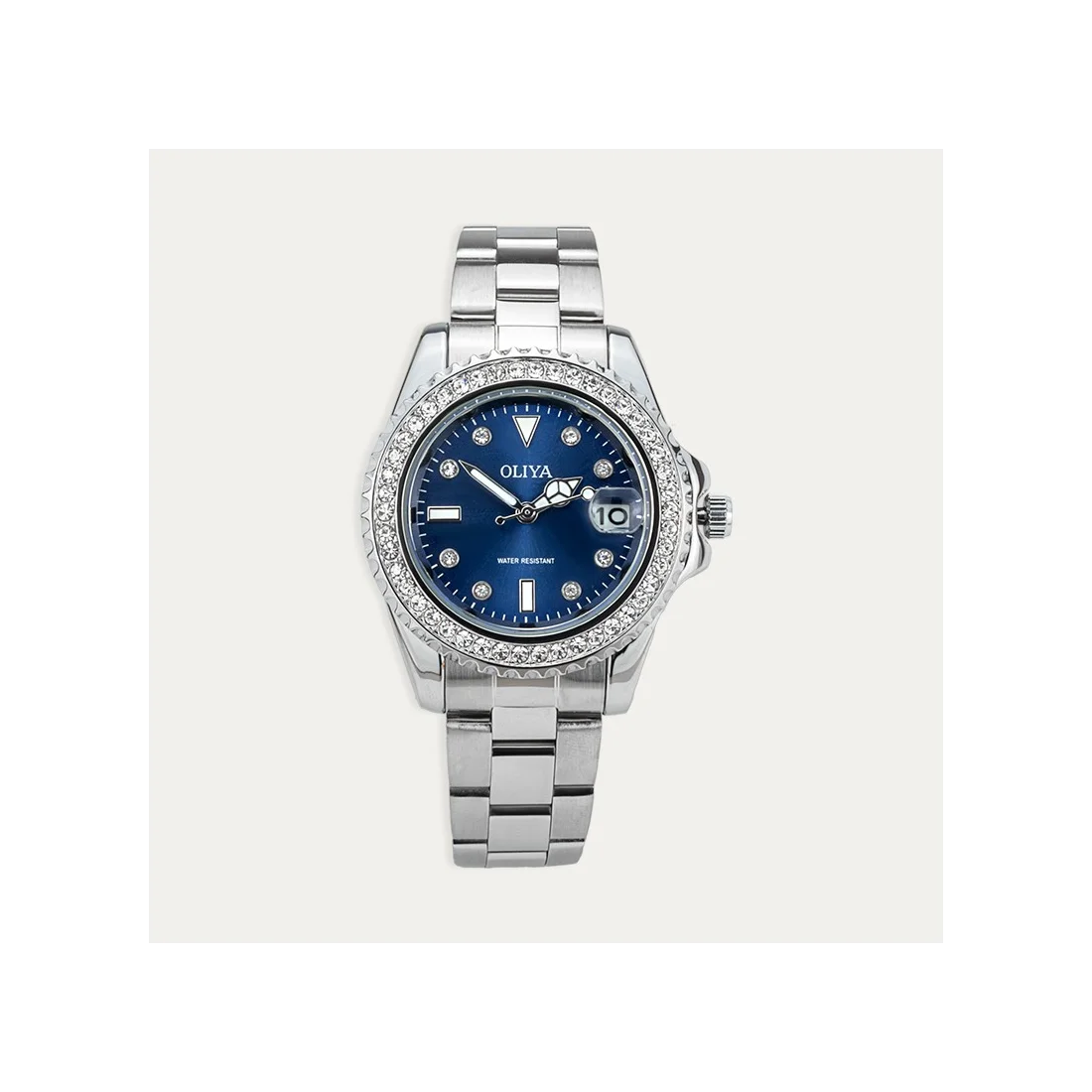 Reloj para mujer de acero con esfera en color azul y calendario incluido. Cuenta con pequeñas circonitas en la esfera y en los números del reloj.