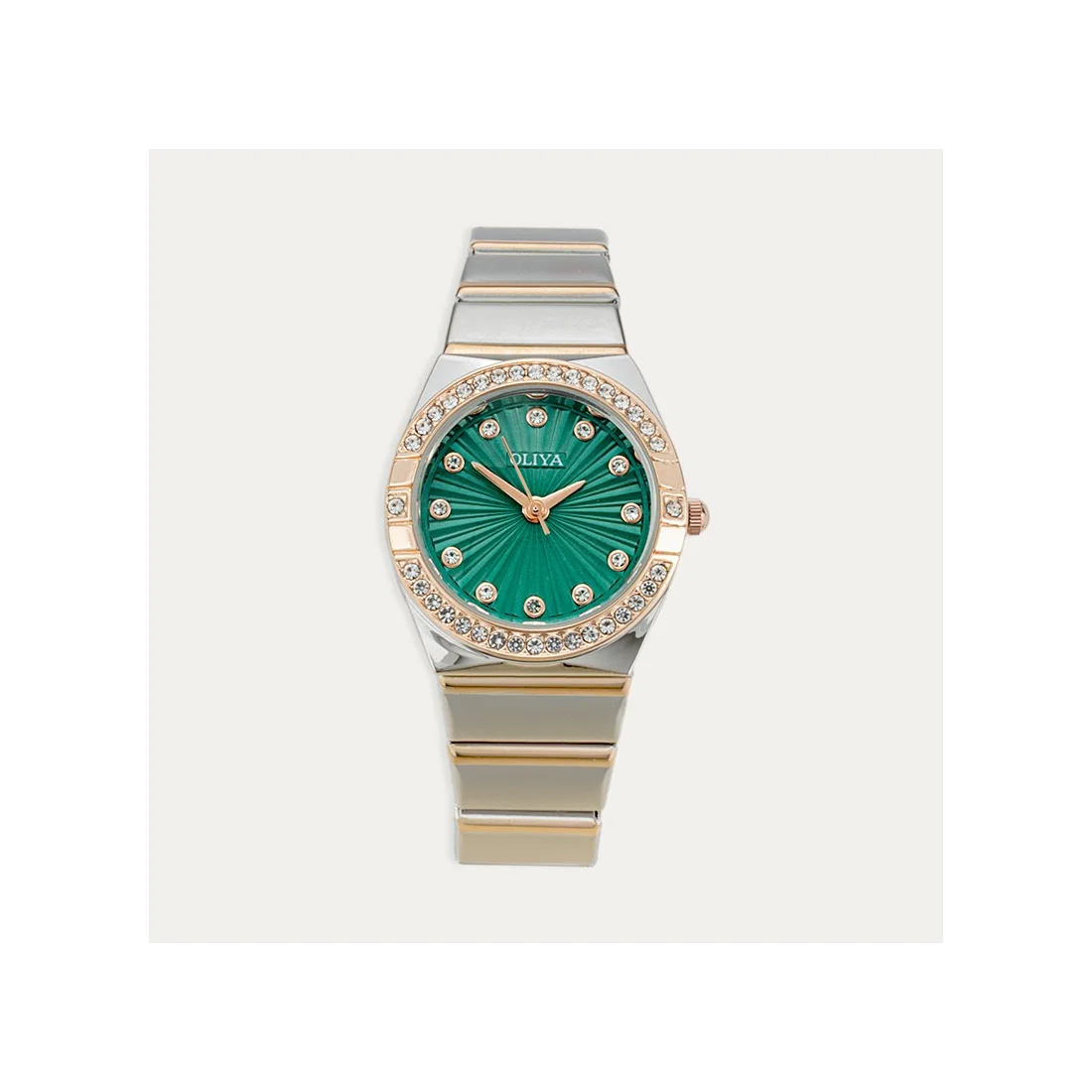 Reloj de acero bicolor con circonitas incluidas y esfera en color verde esmeralda. Disponible hasta final de existencias.