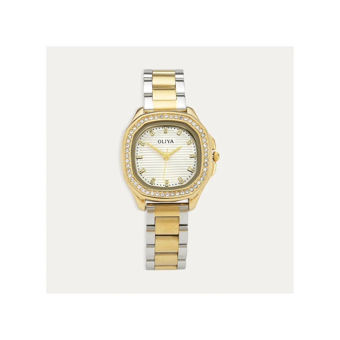Reloj de mujer con esfera en color blanco y circonitas incrustadas. Correa en acero bicolor con esfera dorada.