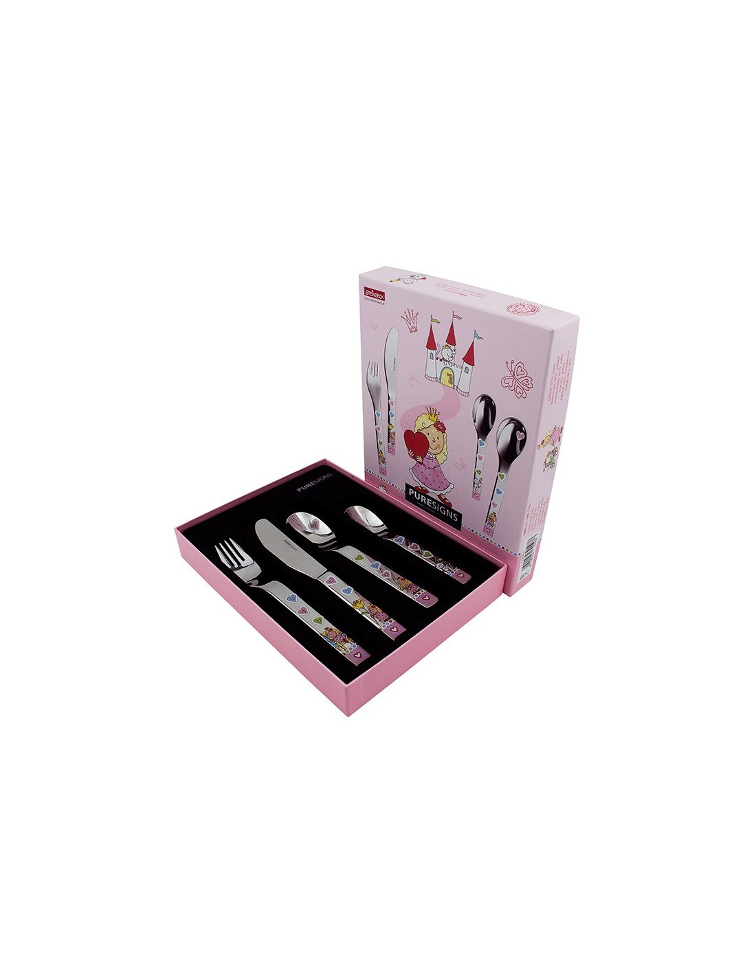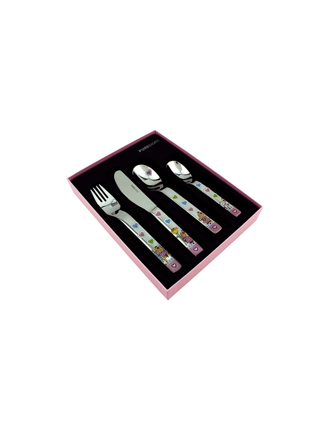 Set cubiertos cuatro piezas en acero en color rosa con dibujos infantiles esmaltados.