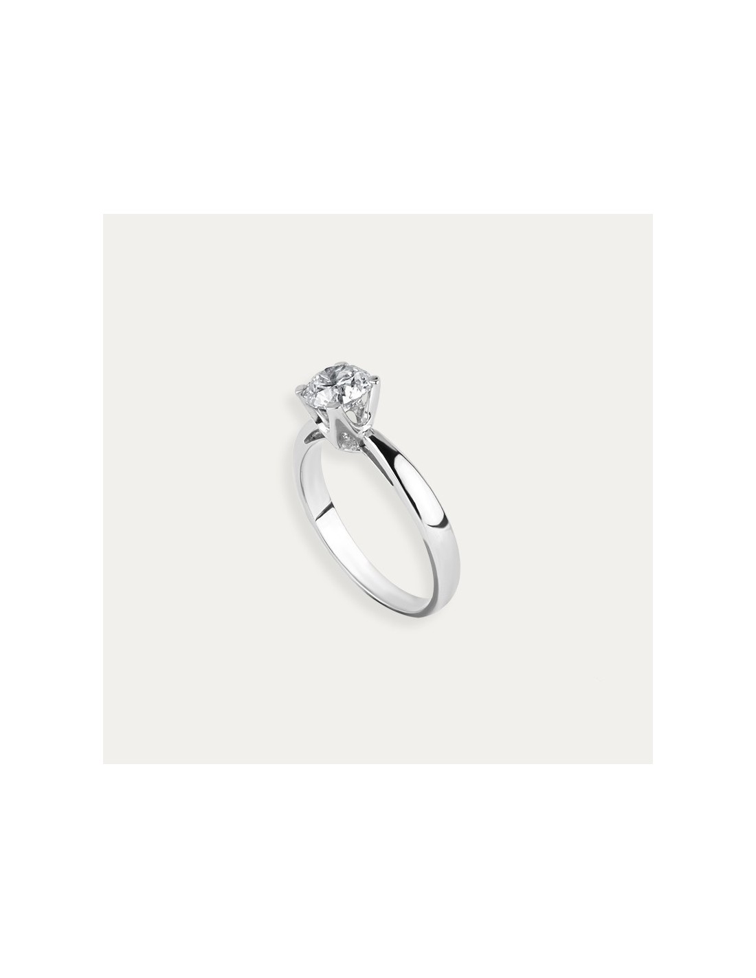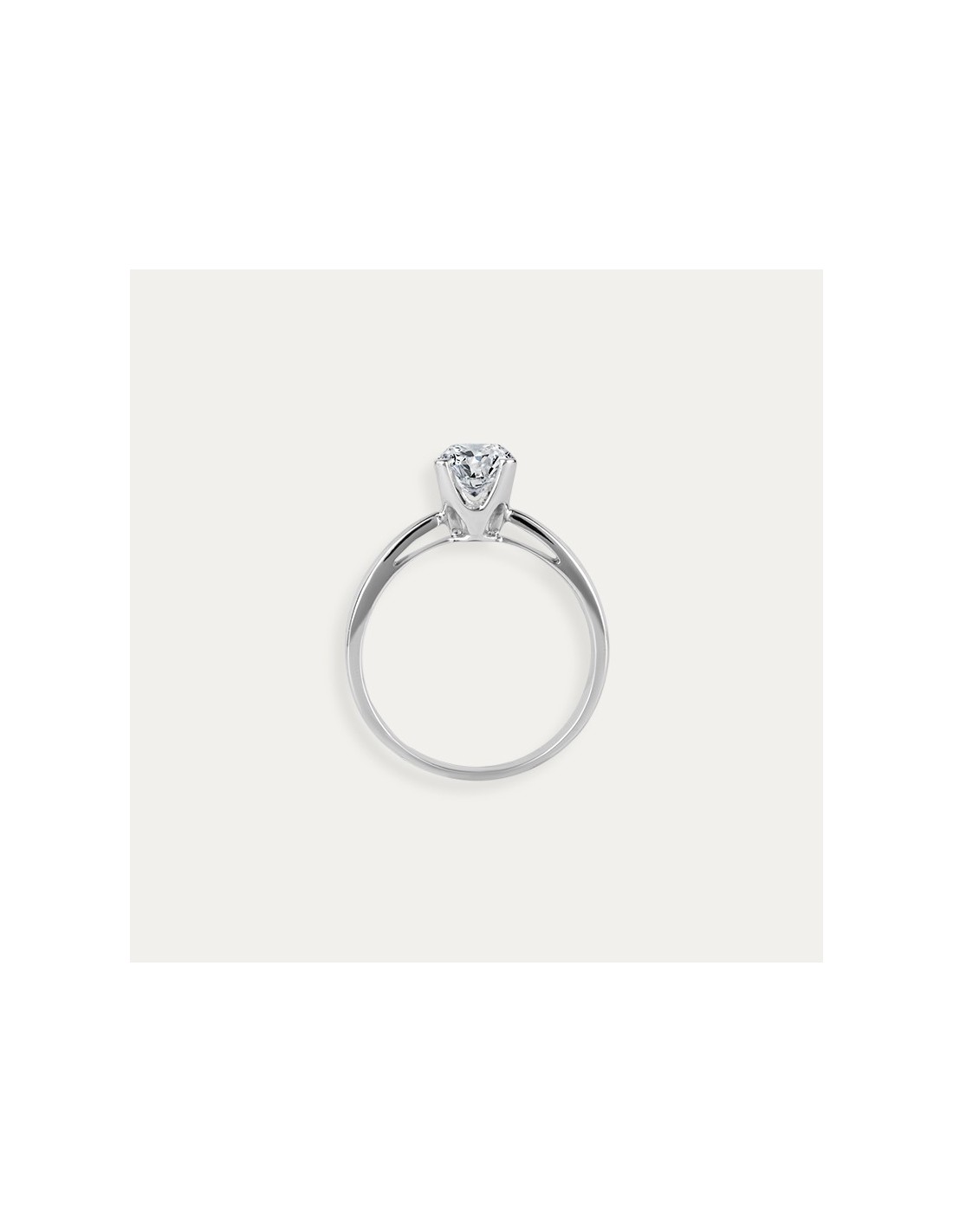 Solitario con diamante central fabricado en oro blanco de 18k. Su original engarce de cuatro garras mantiene el diamante en suspensión consiguiendo un despliegue de luz inigualable. La pieza cuenta con su propio Certificado IGI.