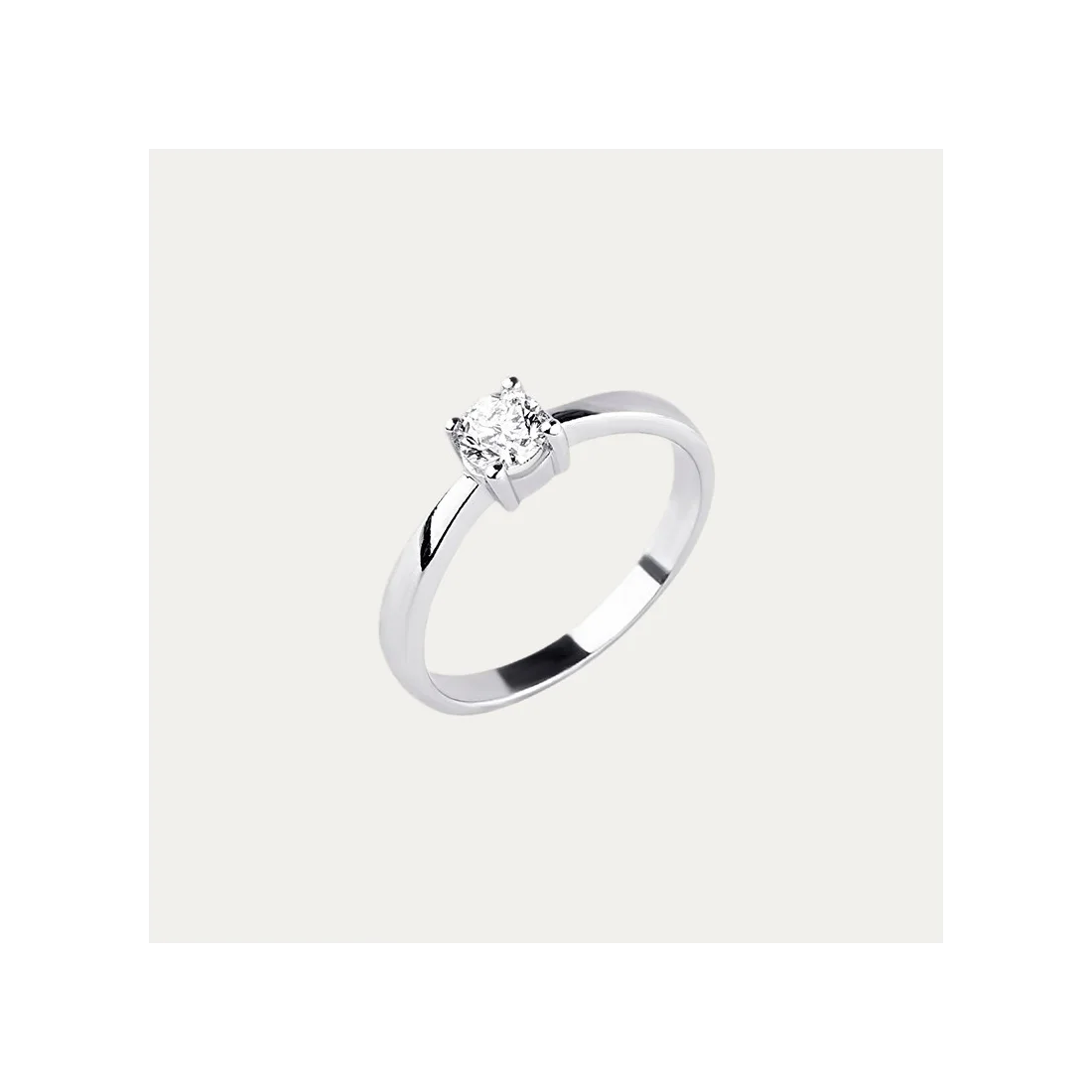 Anillo de Oro blanco de 18 kilates con un diamante engarzado en cuatro garras, resaltando sobre la pieza. Es una joya distinguida que se puede lucir en cualquier ocasión y que te hará ser el foco de atención por su brillo excepcional.