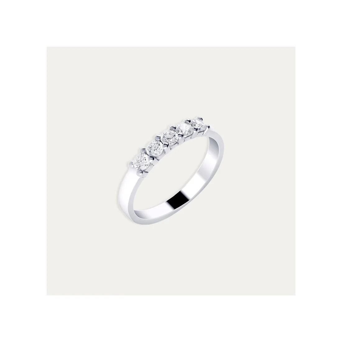 Anillo en Oro 18 kilates blanco con cinco diamantes en garras estilo cinquillo.