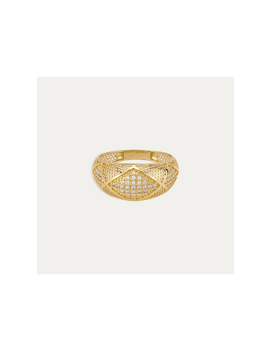 Sortija fabricada en Oro de 18 kilates decorada con circonitas y en patrón por toda la joya. Una pieza llamativa por su diseño.
