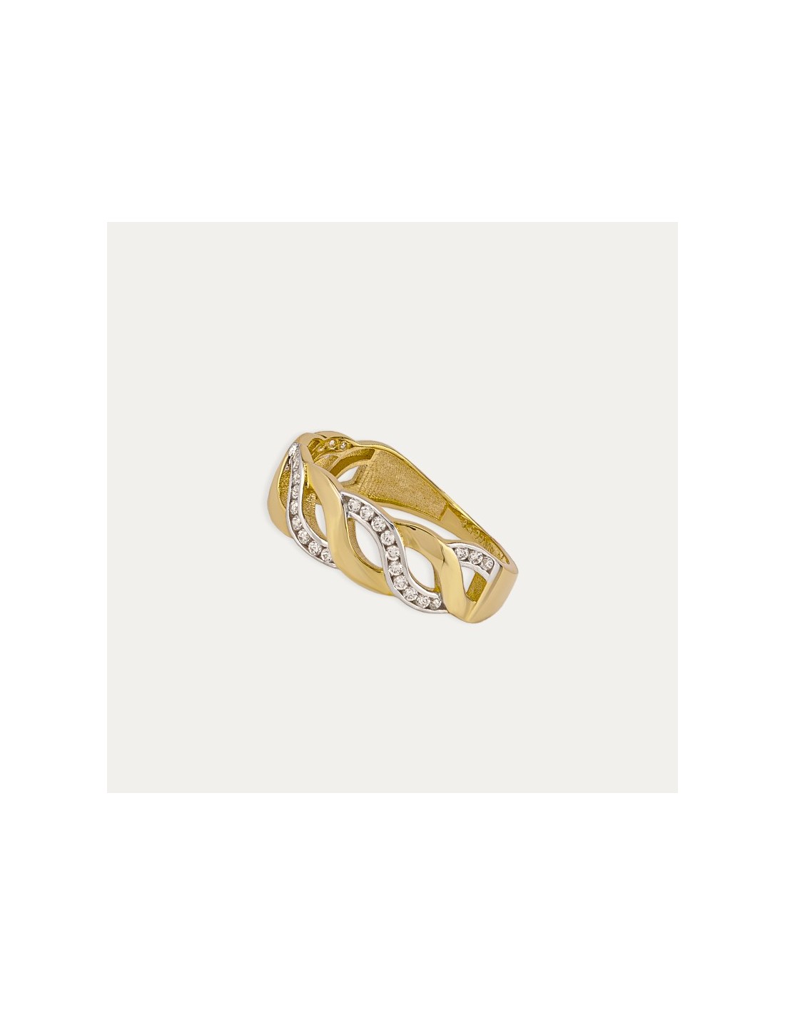 Sortija de oro bicolor 18 quilates con pequeñas circonitas formando carriles. ¡Será tu favorita!