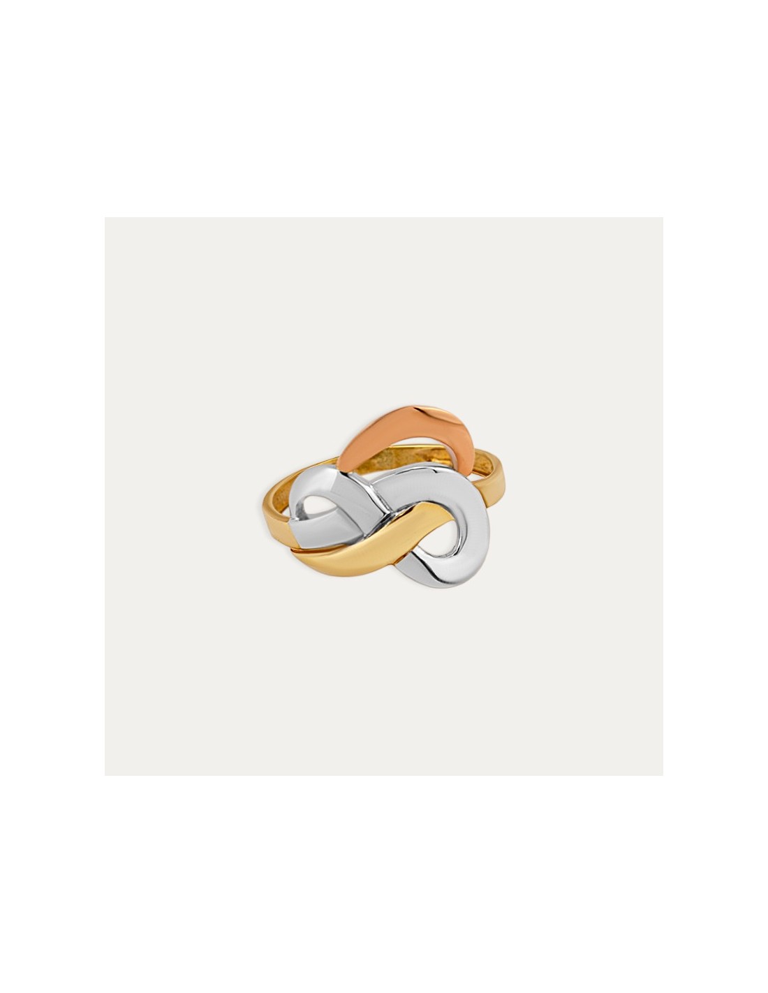 Sortija de oro tricolor de 9 quilates con un diseño entrelazado, una bonita joya para combinar.