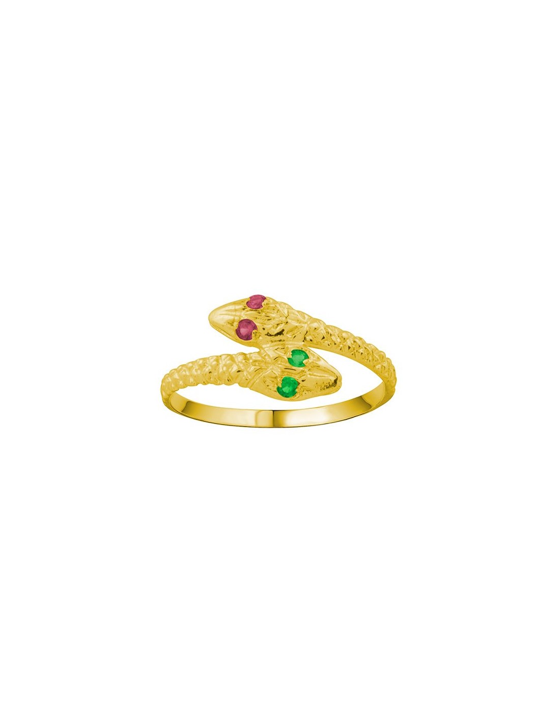 Sortija en Oro 9 quilates con motivo de dos serpientes enroscadas y piedras de color esmeralda y color rubí en los ojos.