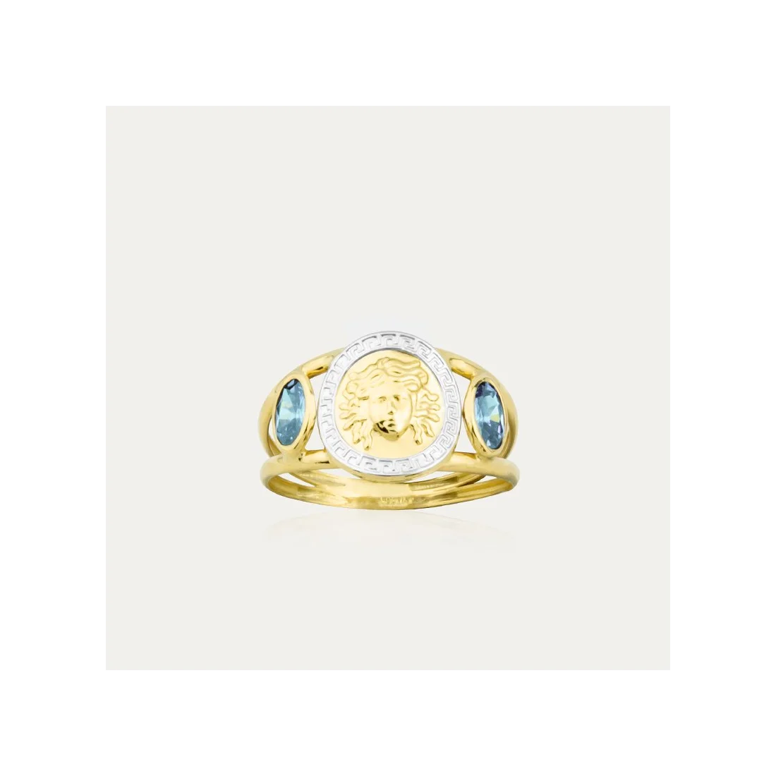 Anillo en Oro 18k con motivo medusa y franja de greca en oro blanco, piedras color agua marina.