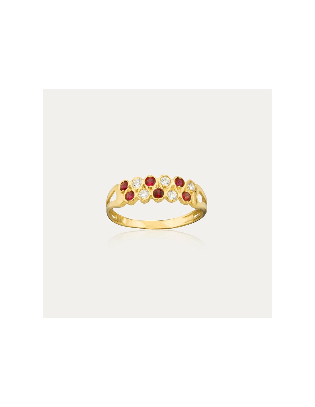 Anillo en Oro de 18 kilates con motivo de 6 circonitas y 6 piedras de color rubí alternas, todas ellas engastadas y en un diseño fino y elegante. Con esta sortija acertaras en cualquier ocasión, combinando con todos los estilos y sobre todo siendo una pieza con apariencia sobresaliente.